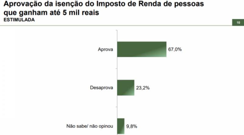 O levantamento apontou que até aquele momento 39,2% dos participantes ainda não tinham conhecimento sobre a medida anunciada pelo governo, enquanto 60,8% afirmaram estar cientes sobre a mudança. Considerando a resposta dos entrevistados diante da proposta, 67% da população aprovou a medida. Por outro lado, 23,2% desprovaram a isenção do IR para quem ganha até 5 mil reais, enquanto 9,8% preferiram não opinar ou não souberam responder.
