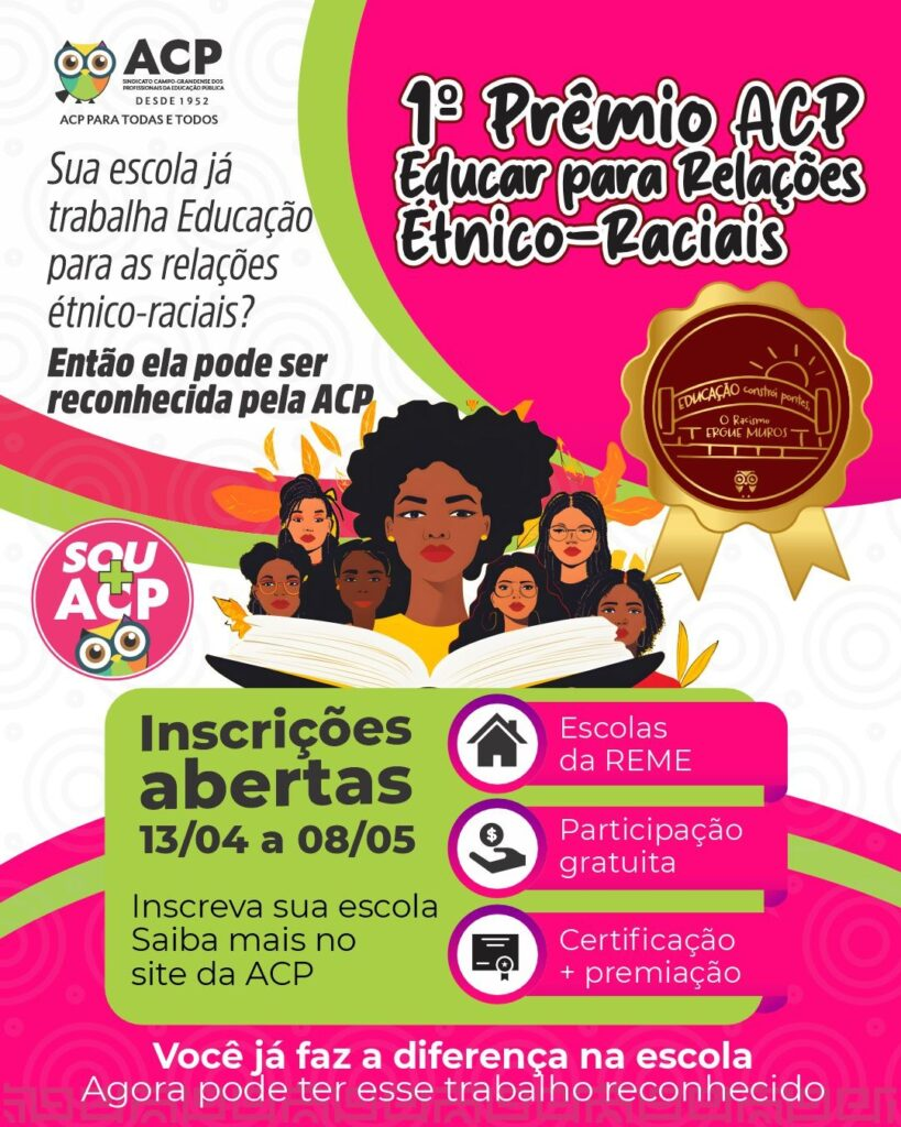 O Sindicato Campo-Grandense dos Profissionais da Educação Pública (ACP) lançou o 1º Prêmio “Educar para as Relações Étnico-Raciais”, iniciativa inédita voltada ao reconhecimento de práticas pedagógicas que promovem a igualdade racial e o enfrentamento do racismo nas escolas da Rede Municipal de Ensino de Campo Grande. A ação reforça o compromisso da entidade com uma educação pública de qualidade, socialmente referenciada e alinhada à valorização da diversidade.