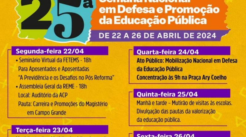 Inicia na próxima segunda-feira (22), a 25ª Semana Nacional em Defesa e Promoção da Educação Pública, realizada pela Confederação Nacional dos Trabalhadores em Educação (CNTE), entre os dias 22 e 26 de abril. O Sindicato Campo-grandense dos Profissionais da Educação Pública – ACP aderiu ao movimento nacional e promoverá uma série de atividades, entre ações nacionais e locais, com destaque para a Mobilização Nacional, na quarta-feira (24). Em Campo Grande a concentração do Ato Público será na Praça Ary Coelho, às 9 horas.