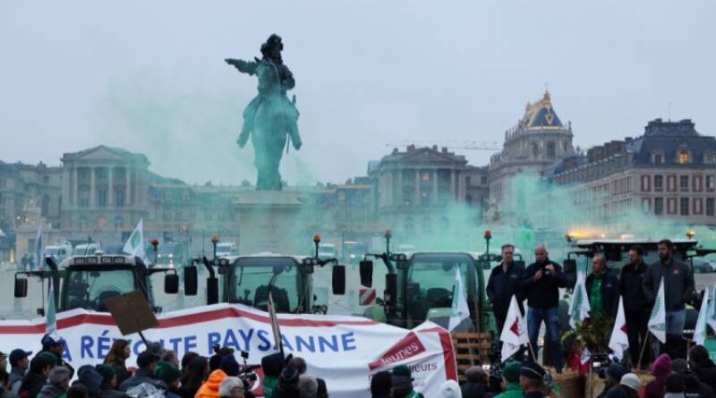 “A revolta camponesa é retomada em Versalhes”. Quase 100 agricultores protestaram nesta sexta-feira (26) diante do famoso palácio francês contra o projeto de acordo comercial entre União Europeia (UE) e Mercosul, como parte de uma jornada de mobilização. Convocados pelo principal sindicato agrícola do país, FNSEA, e seus aliados dos Jovens Agricultores, dezenas de trabalhadores rurais, com 15 tratores, se posicionaram na entrada do palácio, onde acenderam uma fogueira e sinalizadores verdes.