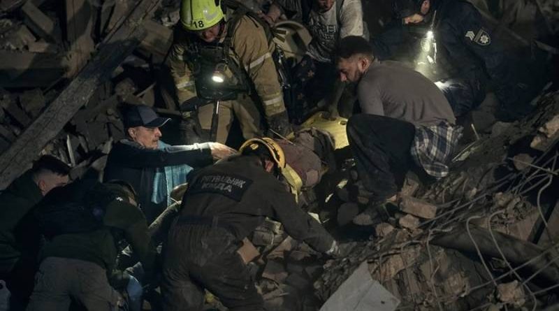 O ministro do Interior da Ucrânia, Ihor Klymenko, disse que uma grande operação de resgate está em andamento no distrito de Svyatoshinsky, em Kiev, envolvendo cães e equipes de engenharia. “Telefones celulares podem ser ouvidos tocando sob as ruínas. A busca continuará até que todos tenham saído. Temos informações sobre duas crianças que não foram encontradas no local do incidente”, acrescentou.