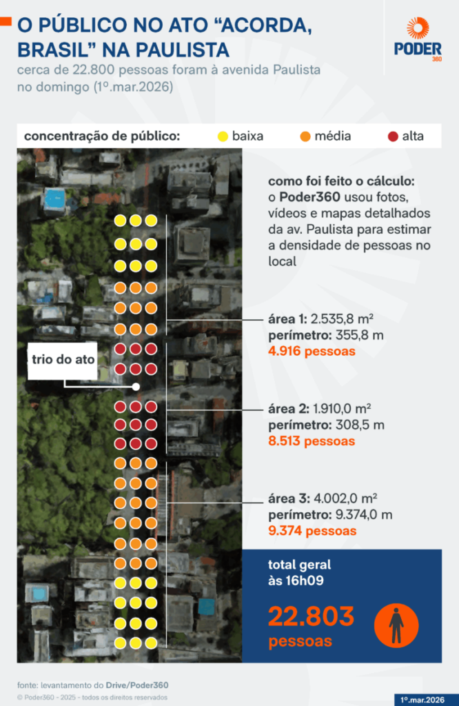 O ato “Acorda, Brasil” convocado pelo deputado federal Nikolas Ferreira (PL-MG) reuniu cerca de 22.800 pessoas neste domingo (1º.mar.2026) na av. Paulista, em São Paulo.