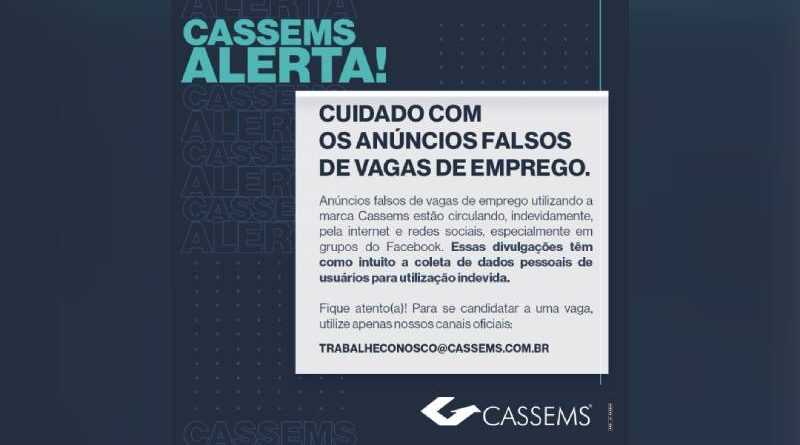 Anúncios falsos de vagas de emprego utilizando a marca Cassems estão circulando, indevidamente, pela Internet e redes sociais, especialmente em grupos do Facebook. Essas divulgações têm como intuito a coleta de dados pessoais de usuários para utilização indevida.