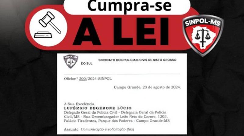 O Sindicato dos Policiais Civis de Mato Grosso do Sul (Sinpol) protocolou nesta sexta-feira, 23.08, o ofício 200/20024 junto à Delegacia Geral de Polícia Civil de Mato Grosso do Sul (DGPC), cientificando-a da operação “Cumpra-se a Lei”, resultante da aprovação do indicativo de greve pela categoria que rejeita proposta do governo do Estado, que desde o início do ano vem prometendo atender as reivindicações salariais da categoria, mas não avançou.