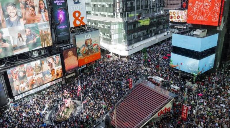 Manifestantes se reúnem na Times Square, em Nova York. Foto: Olga Fedorova/AP