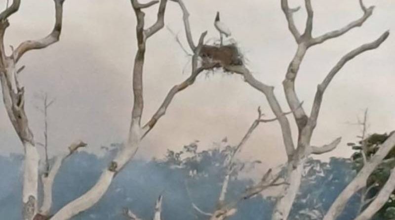 Em meio à fumaça dos incêndios no Pantanal de Mato Grosso do Sul, um ninho de tuiuiú em cima de uma árvore com os galhos secos, foi avistado por bombeiros que passavam de barco pelo Rio Paraguai. A área fica perto da cidade de Corumbá e os socorristas fazem o monitoramento da situação.