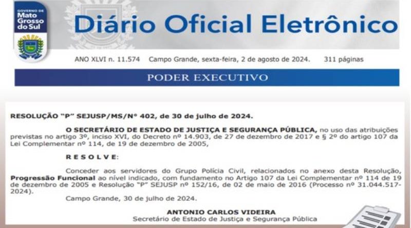 O Diário Oficial do Estado desta sexta-feira (02) traz a publicação da resolução que concede progressão funcional a policiais civis de Mato Grosso do Sul, com fundamento no Artigo 107 da Lei Complementar nº 114 de 19 de dezembro de 2005 e Resolução “P” SEJUSP nº 152/16, de 02 de maio de 2016.