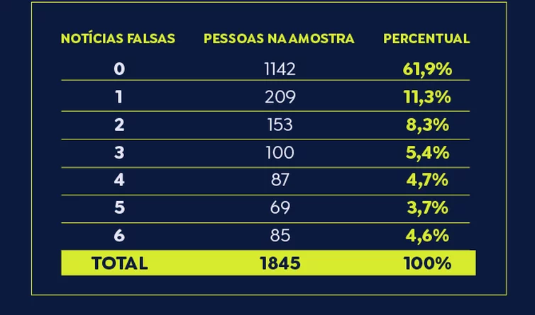 De todos os pesquisados, 11,3% informaram que compartilhariam ao menos uma das notícias falsas e 3,7% informaram que compartilhariam cinco das notícias inverídicas.