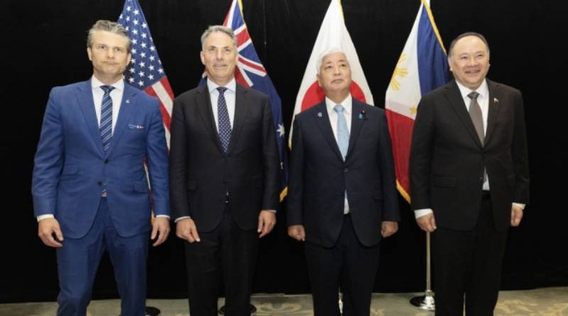 Da esquerda para a direita: o secretário de Defesa dos EUA, Pete Hegseth; o vice-primeiro-ministro e ministro da Defesa da Austrália, Richard Marles; o ministro da Defesa do Japão, Nakatani Gen; e o secretário de Defesa Nacional das Filipinas, Gilberto Teodoro Jr., posam para fotos após reunião multilateral à margem da Cúpula de Defesa Shangri-La Dialogue/Foto: How Hwee Young/EFE/EPA