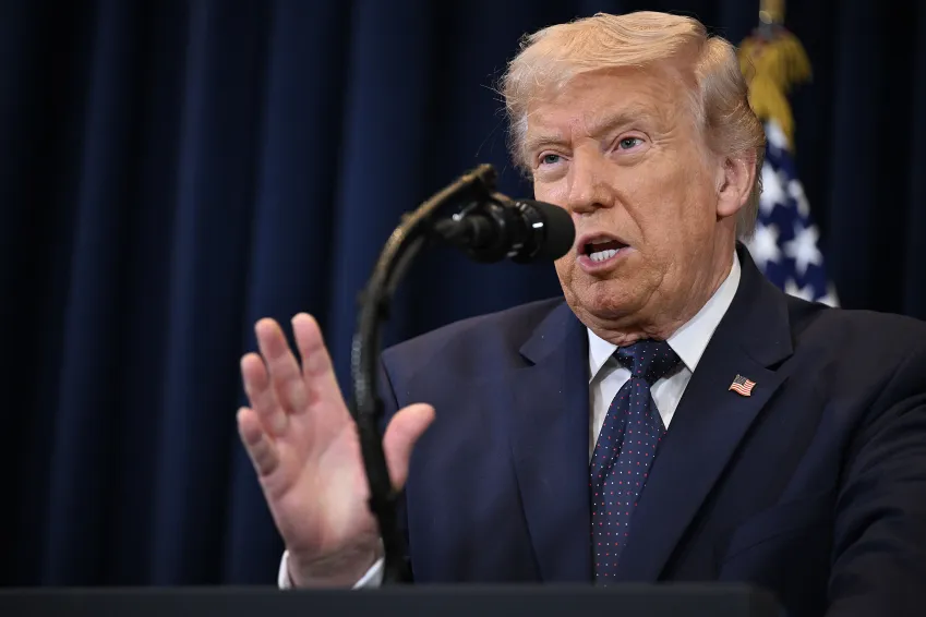 O presidente dos EUA, Donald Trump, durante coletiva de imprensa na Flórida nesta segunda-feira (9) • Roberto Schmidt/Getty Images