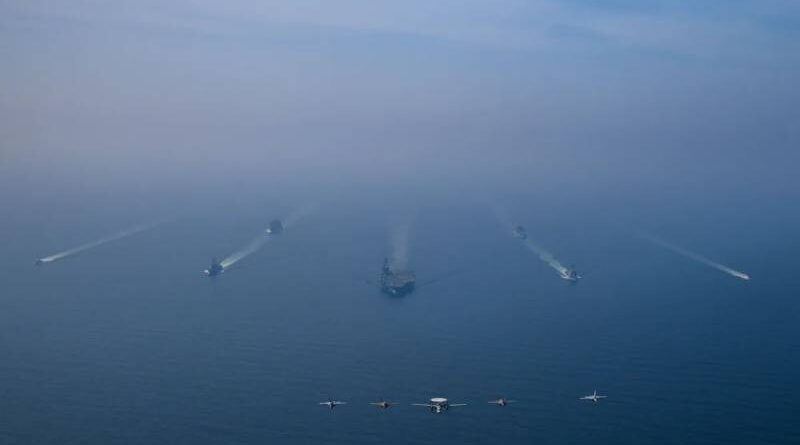 Vista aérea do Grupo de Ataque do Porta-Aviões USS Abraham Lincoln em operação no Mar Arábico, escoltado por dois navios de reabastecimento militar e duas embarcações da Guarda Costeira dos EUA, enquanto caças da Ala Aérea Embarcada Nove realizavam operações de voo sobre o Mar Arábico, em 6 de fevereiro de 2026. • US CENTCOM/Handout/Anadolu via Getty Images