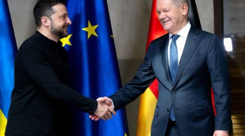Chanceler alemão Olaf Scholz (R) aperta a mão do presidente ucraniano Volodymyr Zelensky durante uma reunião bilateral à margem da 61ª Conferência de Segurança de Munique (MSC) em Munique, sul da Alemanha