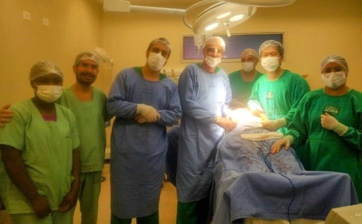 A equipe cirúrgica foi composta por três cirurgiões, um anestesista, um instrumentador cirúrgico, além de uma equipe de enfermagem de apoio. No pré e pós-operatório, uma equipe multidisciplinar, incluindo cardiologistas, intensivistas, enfermeiros, fisioterapeutas e nutricionistas, foi fundamental para garantir o bem-estar e recuperação adequada do paciente.