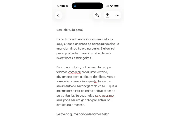 Às 7h19 de 17 de novembro de 2025, quando tentava embarcar para Dubai, Vorcaro escreveu: “Fiz uma correria aqui para tentar salvar. Alguma novidade? Conseguiu ter notícia ou bloquear?”. A pessoa com quem ele se comunicava respondeu com três mensagens de visualização única, que não puderam ser recuperadas.
