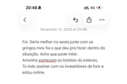 Em outro trecho, às 20h48 do mesmo dia, após uma suposta resposta de Moraes, Vorcaro fala sobre a negociação do Master, possivelmente com o Banco Fictor: “Foi. Seria melhor na sexta junto com os gringos mas foi o que deu pra fazer dentro da situação”. E acrescenta: “Acho que pode inibir”, sem entrar em detalhes do que seria.