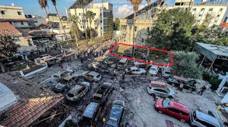 Israel e palestinos trocam acusações sobre a autoria da bomba que atingiu o local. Há diferentes versões sobre o local em que teria sido a explosão e o impacto imediato do episódio. Segundo os israelenses, a explosão teria ocorrido em decorrência da falha em um foguete lançado de dentro da Faixa de Gaza, em um local próximo ao hospital. O artefato, conforme as Forças de Defesa, não atingiu diretamente o centro de saúde, mas seu estacionamento.