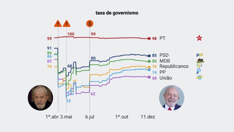 PSD, MDB, Republicanos, PP e União Brasil têm, ao mesmo tempo, um aumento expressivo na taxa de governismo a partir da votação.