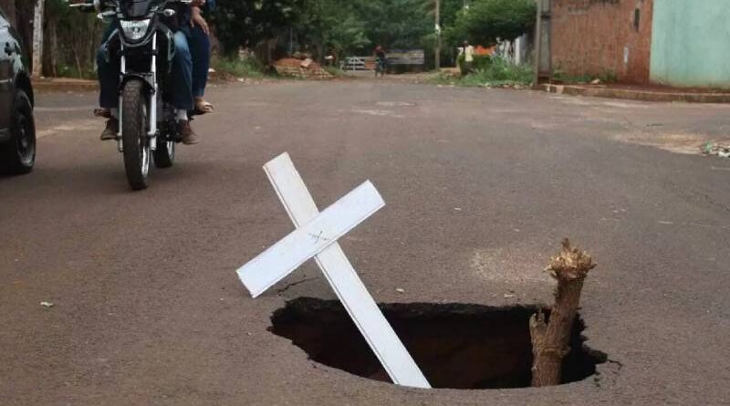 Um buraco surgiu há pouco mais de um mês e passou a representar risco aos moradores na Rua Quiri-Quiri, no Bairro Centenário, conforme o Campo Grande News. Os vizinhos sinalizaram o local com uma cruz para alertar os motoristas do risco de trafegar pela via.