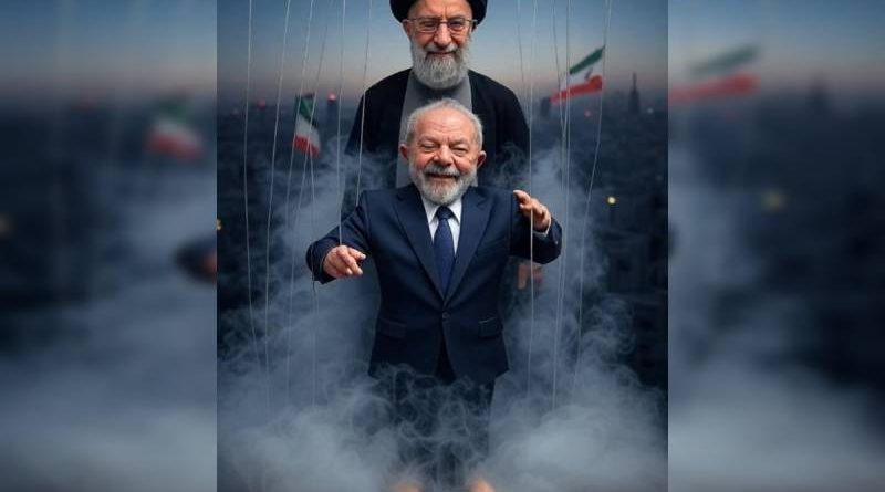 As declarações do ministro foram divulgadas na rede social X, escritas em português e acompanhadas de uma imagem gerada por inteligência artificial, na qual o líder supremo do Irã, Ali Khamenei, aparece atrás do presidente Lula, segurando cordas de marionete, como se estivesse controlando-o. Veja: