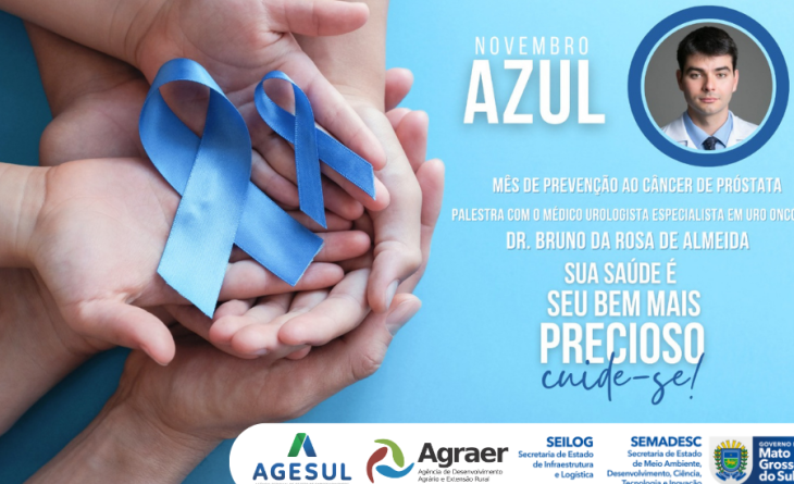 Engajadas na campanha Novembro Azul, a Seilog (Secretaria Estadual de Infraestrutura e Logística) e a Agesul (Agência Estadual de Gestão de Empreendimentos) vão reforçar as discussões sobre a saúde do homem no próximo dia 21, durante palestra com o médico especialista em Uro-oncologia, Bruno da Rosa Almeida. Voltado aos servidores, o evento será realizado às 10h na Agraer (Agência de Desenvolvimento Agrário e Extensão Rural).