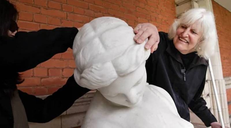 Georgina Kleege aparece de perfil, vestindo uma roupa preta, e tocando a cabeça da escultura
