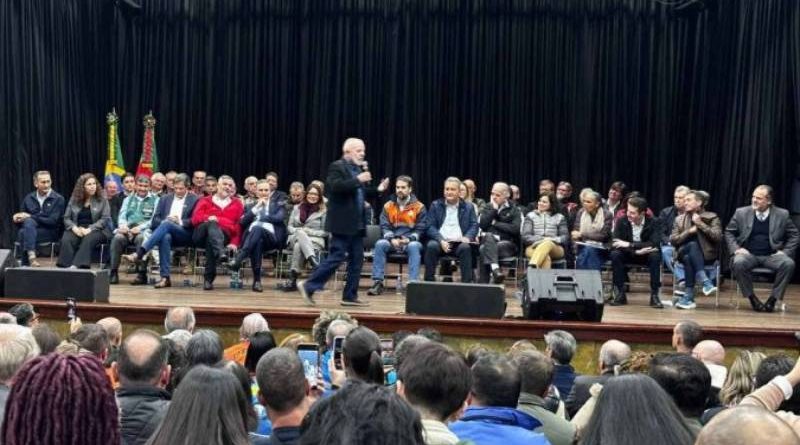 Lula, ao microfone, em São Leopoldo, no anúncio de medidas para o Rio Grande do Sul: evento com palco, autoridades e plateia – (crédito: Henrique Lessa/CB/DA.Press)