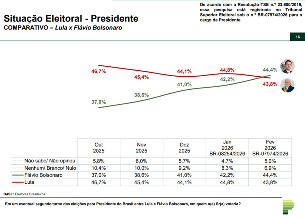 A nova rodada de pesquisa divulgada, nesta sexta-feira (27/2), pelo Instituto Paraná Pesquisas, indica que o senador Flávio Bolsonaro (PL) supera numericamente o presidente Luiz Inácio Lula da Silva (PT) no segundo turno das disputas presidenciais.