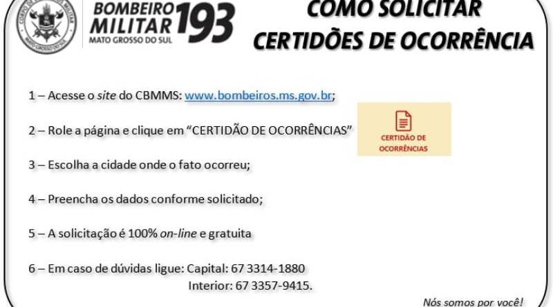 Campo Grande (MS) – O Corpo de Bombeiros Militar do Estado de Mato Grosso do Sul orienta aos interessados que precisam retirar certidões da corporação que acompanhe abaixo o passo a passo para solicitar os documentos. Caso tenha alguma dúvida ou dificuldade, por gentileza, entrar em contato no (67) 3314-1880 ou (67) 3357-9415