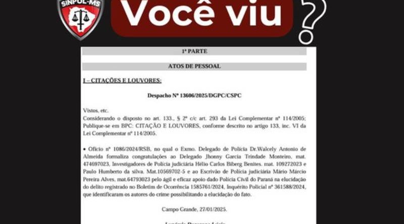 O reconhecimento foi oficializado por meio do Despacho Nº 13606/2025/DGPC/CSPC, publicado no Diário Oficial do Estado, citando nominalmente os policiais que participaram da operação, os investigadores Hélio Carlos Biberg Benites e Paulo Humberto da Silva, o escrivão Mário Márcio Pereira Alves e o delegado Jhony Garcia Trindade.