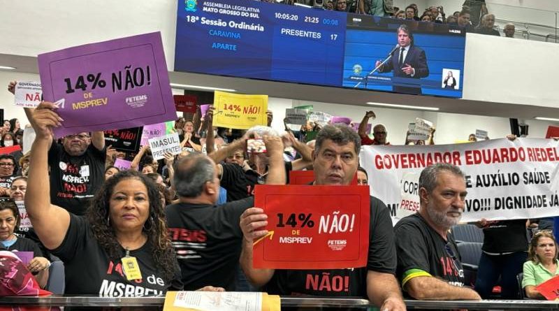 Cerca de 600 professores e administrativos da educação lotaram o plenário da Assembleia Legislativa de Mato Grosso do Sul e reforçaram a luta contra o desconto de 14% da previdência sobre os benefícios pagos aos aposentados e pensionistas. A categoria pede que o Governo do Estado isente da cobrança previdenciária até o valor do teto nacional pago pelo INSS (Instituto Nacional de Seguro Social).