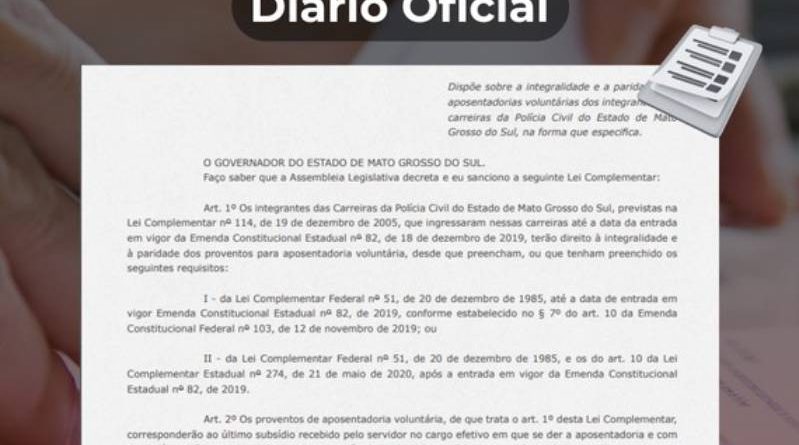 Foi publicada no Diário Oficial desta terça-feira (04) a Lei Complementar nº 331, de autoria do Poder Executivo, que dispõe sobre a integralidade e a paridade das aposentadorias voluntárias dos integrantes das carreiras da Polícia Civil de Mato Grosso do Sul.