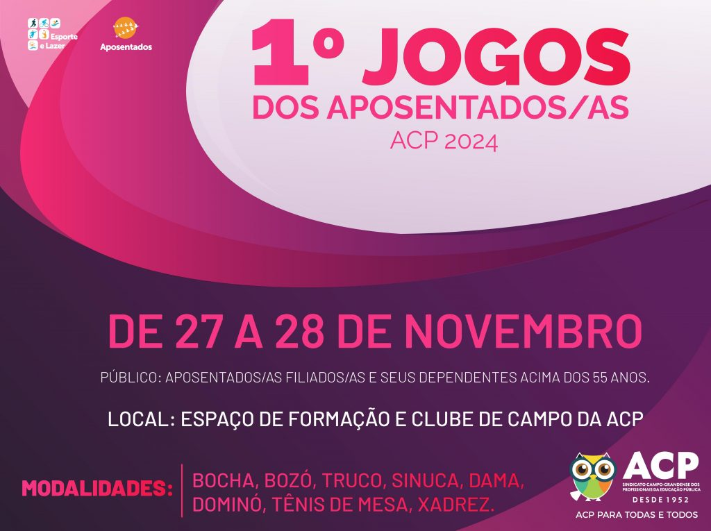 O Sindicato Campo-Grandense dos Profissionais da Educação Pública (ACP) realizará o 1º Jogos dos Aposentados, nos dias 27 e 28 de novembro, evento que reunirá educadores que marcaram história na educação de Campo Grande. Este momento de integração, competição e lazer tem como objetivo proporcionar aos professores aposentados, filiados à ACP, uma experiência divertida e repleta de boas memórias, além de fortalecer o vínculo com os colegas de profissão.