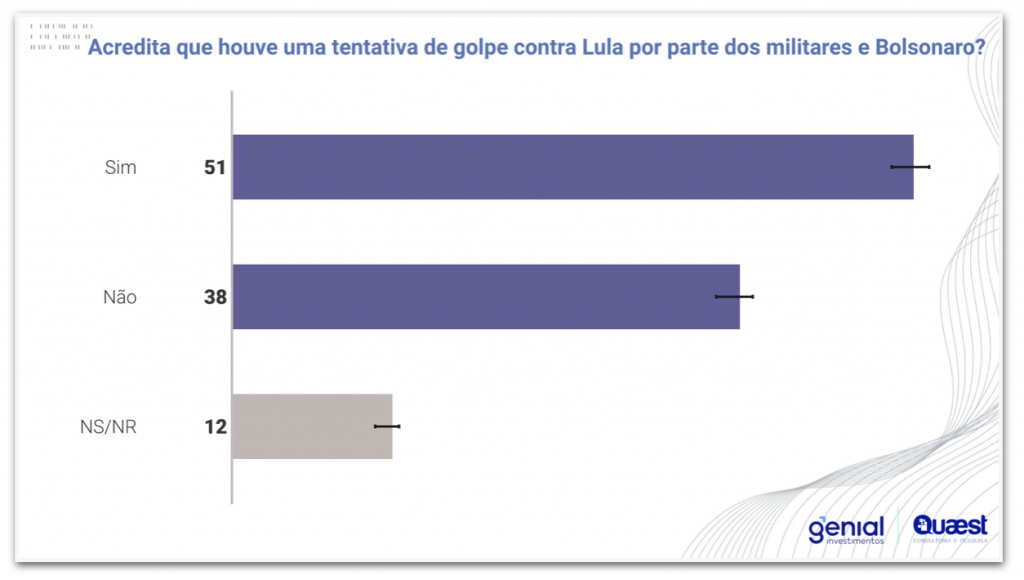 Pesquisa da Quaest divulgada nesta 6ª feira (13.dez.2024) afirma que 51% dos brasileiros acreditam que o ex-presidente Jair Bolsonaro (PL) e militares tentaram aplicar um golpe de Estado contra Luiz Inácio Lula da Silva (PT). Eis a íntegra (PDF – 13 MB).