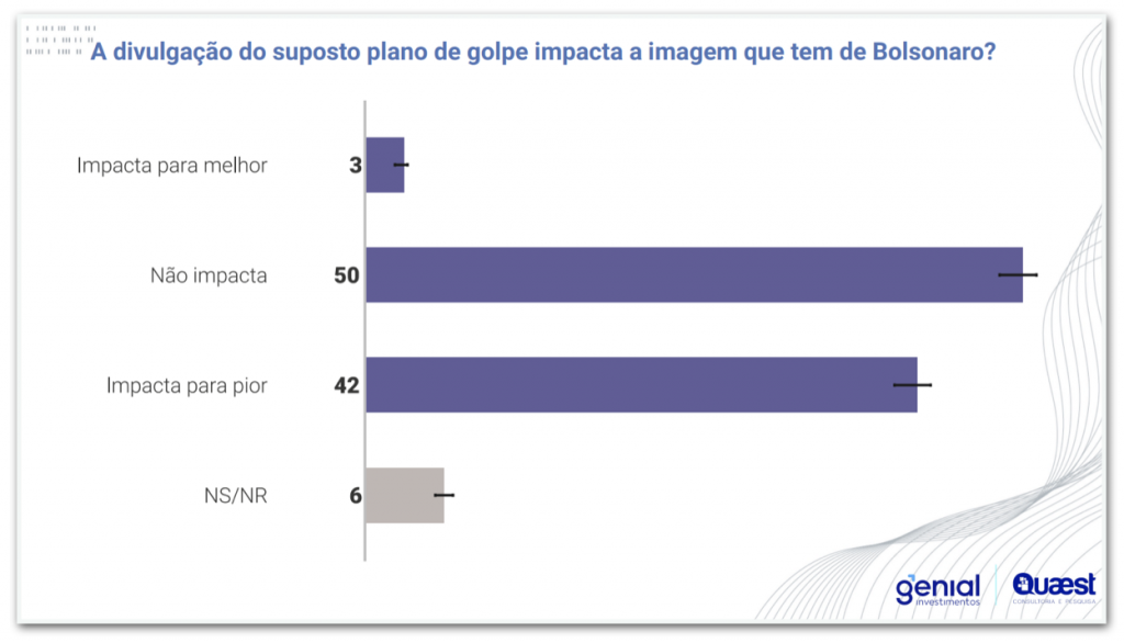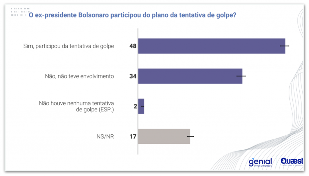 Para 48% dos entrevistados, Bolsonaro participou do plano de golpe contra Lula, enquanto 34% pensam que o ex-presidente não teve envolvimento. Outros 2% ainda alegam que não houve nenhuma tentativa de golpe e 17% não sabem ou não responderam.