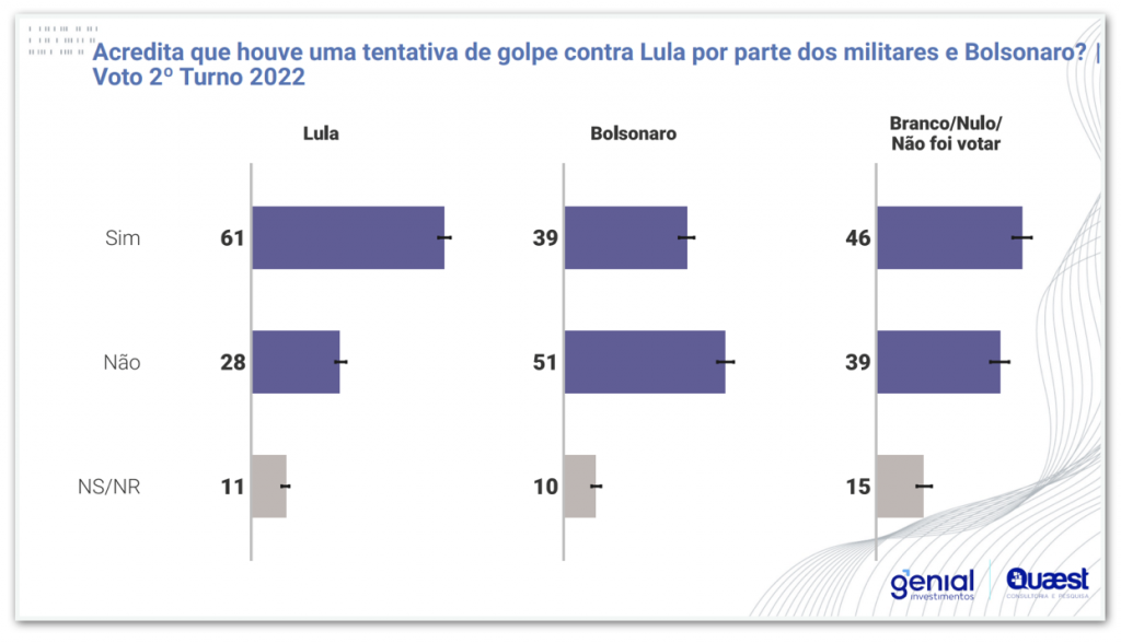 A Quaest apresentou também os dados filtrados pelo voto no 2º turno das eleições de 2022. Entre os eleitores de Lula, 61% acreditam que houve tentativa de golpe por parte dos militares e de Bolsonaro, enquanto 28% dizem que não. No mesmo recorte, 59% pensam que Bolsonaro participou da tentativa de golpe e 24% pensam que ele não teve envolvimento.