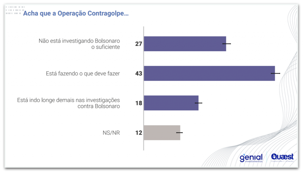 A Quaest também perguntou a opinião dos entrevistados sobre a “Operação Contragolpe”. Cerca de 27% disseram que Bolsonaro não está sendo investigado o suficiente, enquanto 43% afirmaram que a investigação está fazendo o que deve. Para 18%, a Polícia Federal está indo longe demais nas investigações contra Bolsonaro. Outros 12% não sabem ou não responderam.
