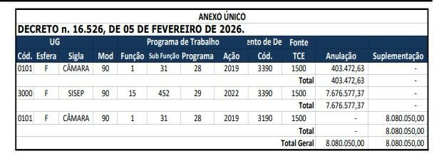 Conforme o Decreto n. 16.526, de 05 de fevereiro de 2026, foram anulados R$ 403.472,63 da Câmara e R$ 7.676.577,37 da Secretaria de Infraestrutura previstos no orçamento do município, e os R$ 8.080.050,00 foram repassados ao Legislativo. As ações são referentes aos anos de 2019 e 2022.