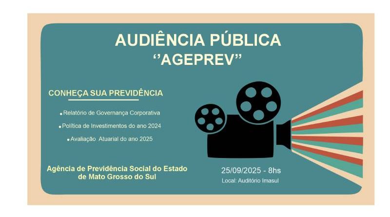 A Agência de Previdência Social de Mato Grosso do Sul (AGEPREV) realiza nesta quinta-feira, 25 de setembro, uma audiência pública destinada à apresentação do Relatório de Governança, dos resultados da Política de Investimentos referentes ao exercício de 2024 e da Avaliação Atuarial de 2025.