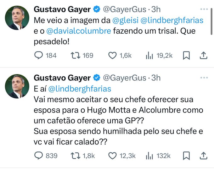 “E aí Lindbergh Farias, vai mesmo aceitar o seu chefe oferecer sua esposa para o Hugo Motta e Alcolumbre como um cafetão oferece uma GP?? Sua esposa sendo humilhada pelo seu chefe e você vai ficar calado?”, perguntou Gayer em seu perfil no X na quarta-feira.