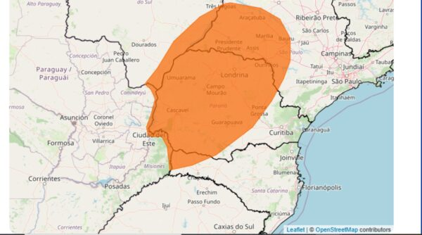 Já para boa parte do Paraná e sul de São Paulo estão sob alerta laranja de tempestade. Nessas regiões é esperado que as precipitações fiquem na casa dos 30 a 50 mm/h e ventos de 60 a 100 km/h.