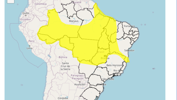 Além dos três alertas para tempestade, o Inmet emitiu um alerta amarelo de chuvas intensas que abrange grande parte da região Norte, Centro-Oeste, Maranhão, sul do Piauí e Bahia.
