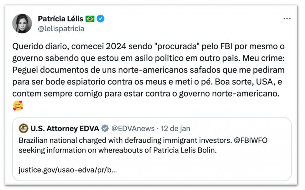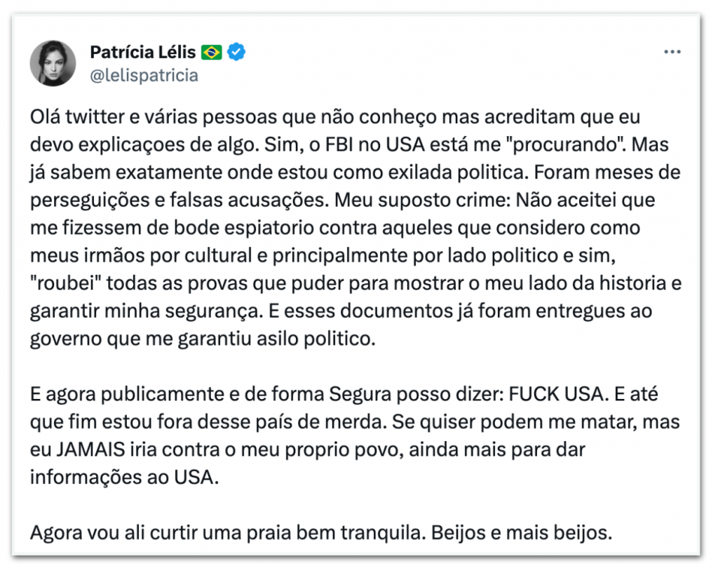 Lélis se defendeu em duas publicações no X. Escreveu que podem “sempre” contar com ela “para estar contra o governo norte-americano”. A jornalista afirmou ter “roubado” as provas para mostrar o seu lado da história e garantir sua segurança “E esses documentos já foram entregues ao governo que me garantiu asilo politico”, declarou, sem dizer em que país está.