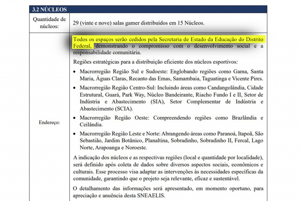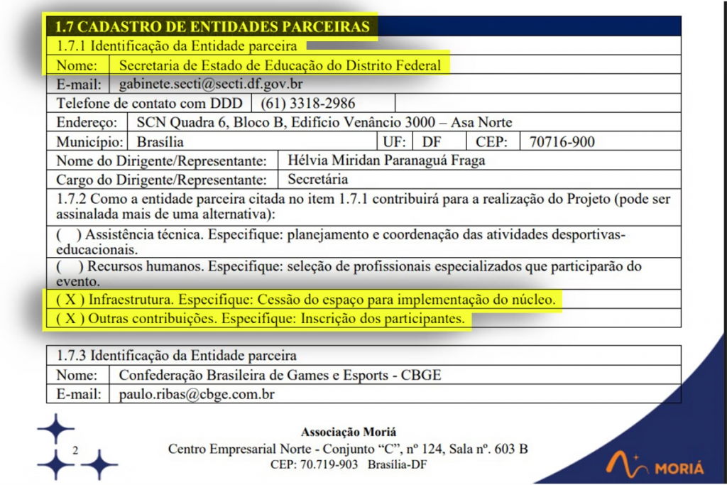 Para acessar a emenda da bancada do DF no valor de R$ 37,9 milhões, a OSC apresentou ao Ministério do Esporte um projeto técnico-pedagógico no qual afirma que criaria 29 salas gamers em espaços cedidos pela Secretaria de Educação, que também faria a inscrição de alunos da rede pública para as aulas de games. No entanto, a pasta distrital nega ter aprovado qualquer proposta da ONG.