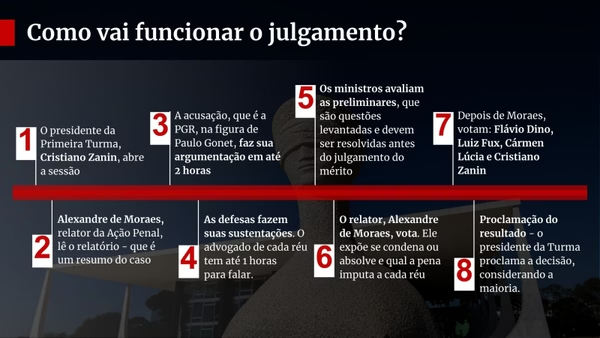 O procurador-geral da República, Paulo Gonet, defende a condenação de todos os oito réus. Já as defesas dizem que os clientes são inocentes.