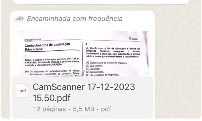 O arquivo com 12 páginas em formato PDF foi compartilhado, e mostra as 30 questões da prova em branco. O material tem até a logomarca do Instituto Avalia, responsável pela formulação do exame. “A prova foi fotografada e distribuída. Esse scanner está rodando nos grupos e está em branco”, relata um participante que entrou em contato com a redação.