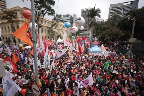 A manifestação da esquerda foi contra a anistia aos envolvidos nos ataques violentos às sedes dos Três Poderes, em 8 de janeiro de 2023, e em defesa da soberania nacional.