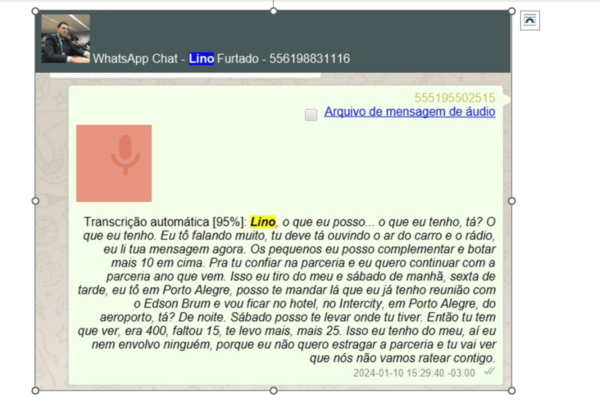 As conversas, iniciadas em novembro de 2023, são entre o assessor Lino Furtado e Cliver Fiegenbaun, que seria um captador de recursos para um hospital no Rio Grande do Sul.
