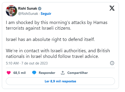 Emmanuel Macron e Rishi Sunak estão entre os chefes de Estado que manifestaram apoio aos israelenses; ofensiva surpresa deixou ao menos 22 mortos