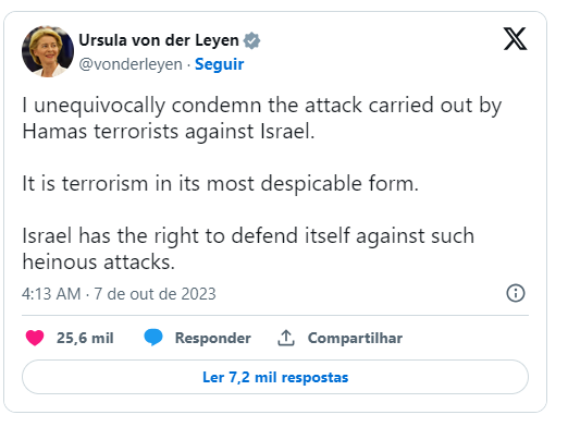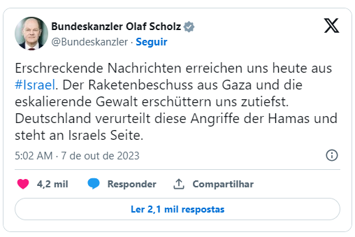 O chanceler da AlemanhaOlaf Scholz, se manifestou nas redes sociais, declarando apoio a Israel e condenando os ataques do Hamas. “Notícias horríveis chegam até nós hoje de Israel. O lançamento de foguetes de Gaza e a escalada da violência chocam-nos profundamente. A Alemanha condena estes ataques do Hamas e apoia Israel”, afirmou o alemão. A presidente da Comissão Europeia, Ursula von der Leyen, também se manifestou, classificando a ofensiva como “terrorismo na sua forma mais desprezível”. “Condeno inequivocamente o ataque levado a cabo pelos terroristas do Hamas contra Israel. […] Israel tem o direito de se defender contra tais ataques hediondos”, disse a presidente da Comissão. Até o momento, o presidente dos Estados Unidos, Joe Biden, a Organização das Nações Unidas e o presidente Lula não se posicionaram oficialmente.