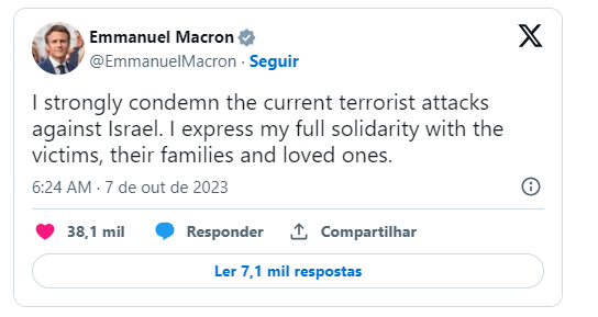 A ofensiva surpresa do Hamas contra Israel gerou reações ao redor do mundo. Horas depois do início dos ataques, que deixaram 22 mortos até o momento, diversas autoridades já se manifestaram e repudiaram as ações do grupo. Dentre eles, está o presidente da FrançaEmmanuel Macron, que disse condenar o ataque contra o território israelense. “Condeno veementemente os atuais ataques terroristas contra Israel. Expresso a minha total solidariedade às vítimas, às suas famílias e entes queridos”, disse o francês em suas redes sociais. O primeiro-ministro do Reino UnidoRishi Sunak também se manifestou oficialmente, dizendo estar chocado com a ofensiva e que mantém contato com as autoridades israelenses e cidadãos britânicos no país. “Estou chocado com os ataques desta manhã perpetrados por terroristas do Hamas contra cidadãos israelitas. Israel tem o direito absoluto de se defender. Estamos em contato com as autoridades israelenses e os cidadãos britânicos em Israel devem seguir os conselhos de viagem”, disse o britânico.